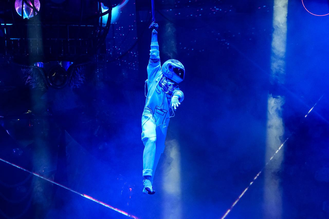 - Воздушный гимнаст на ремнях Тимур Гончаров в образе первого покорителя космоса – Юрия Гагарина;